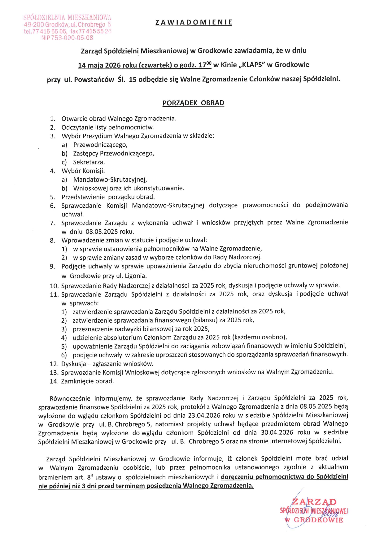 Walne Zgromadzenie Członków SM - 14 maja (czwartek), godz. 17:00