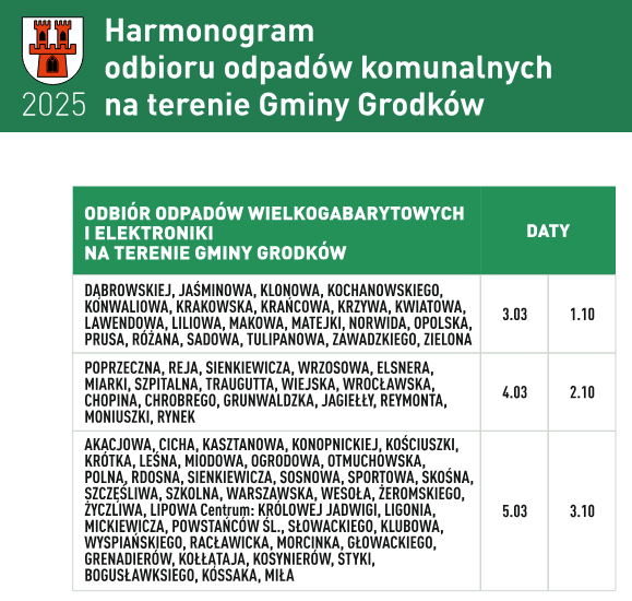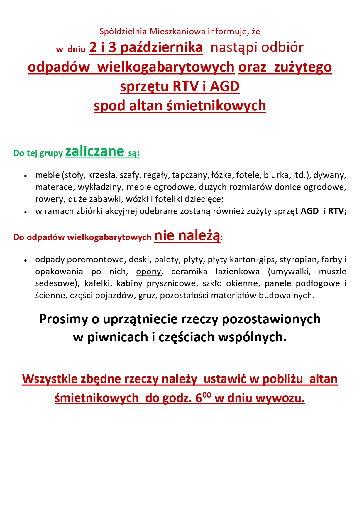 W dniach 2 i 3 października firma Komunalnik odbierze spod altan śmietnikowych odpady wielkogabarytowe. Odbiór rozłożony został na 2 dni wiec proszę o sprawdzenie w harmonogramie, którego dnia odbiór będzie miał miejsce na Państwa ulicy ( w Państwa altance).