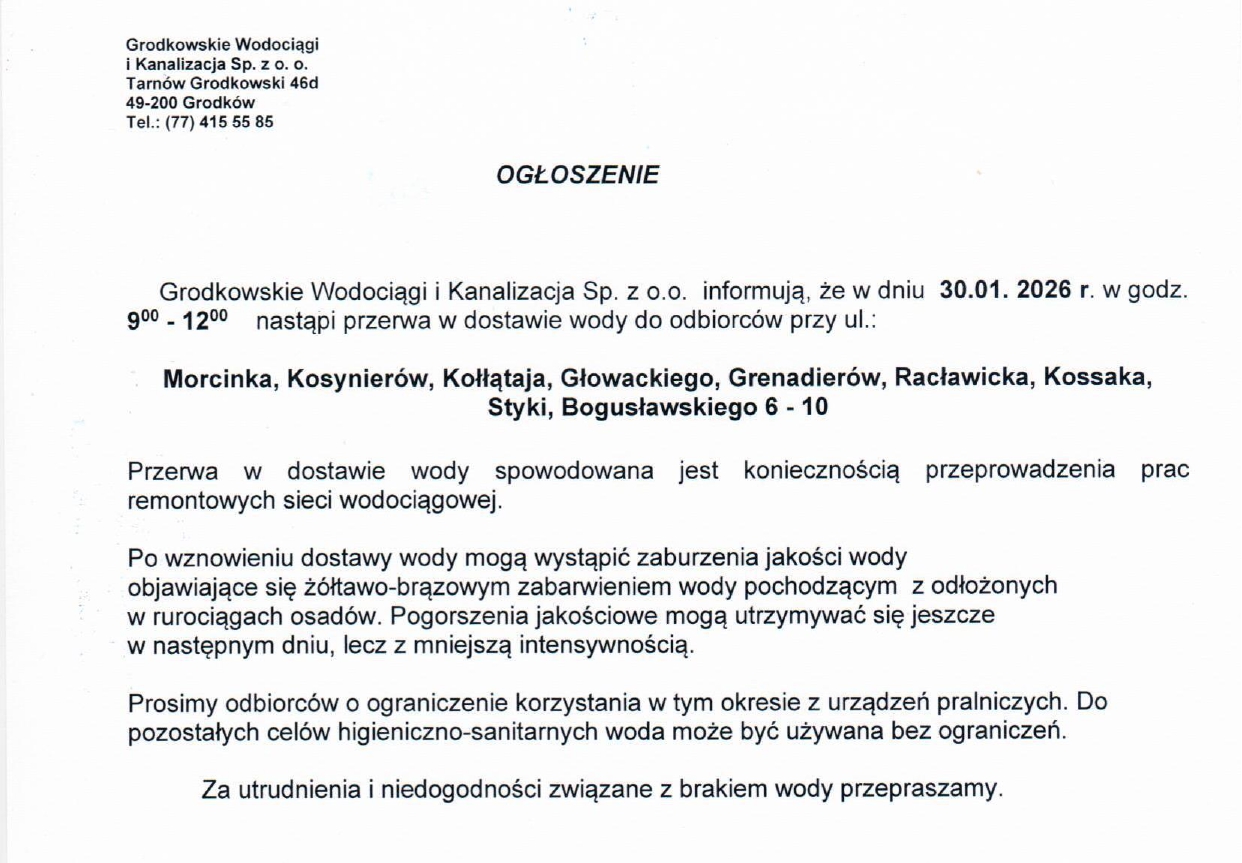› 30 stycznia Osiedle Morcinka - przerwa w dostawie wody